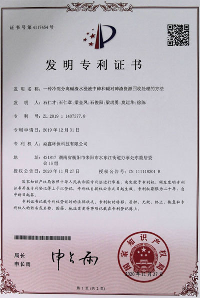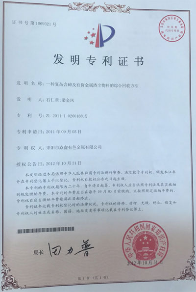 2 | 發(fā)明 | 2011.09.05 | 201110260188X | 一種復(fù)雜含砷及有價金屬渣塵物料的綜合回收方法 |